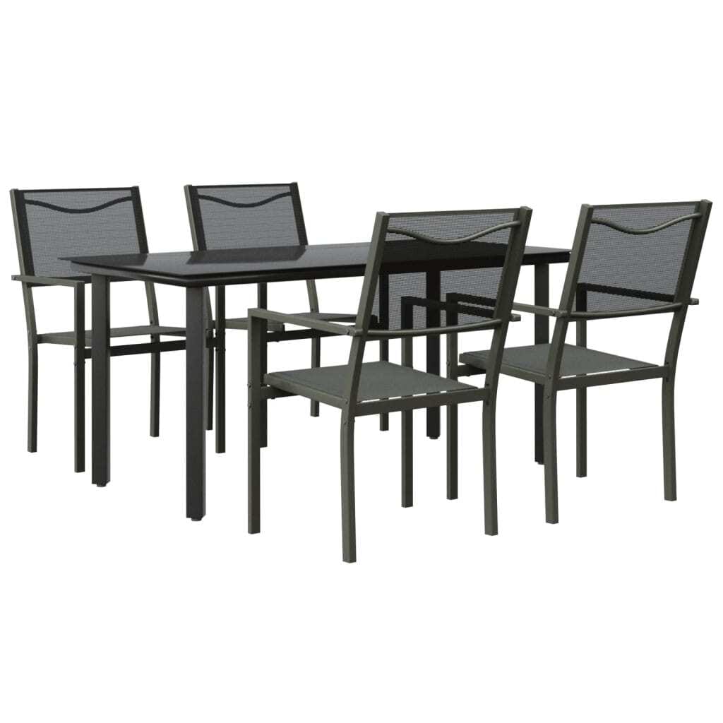 This 5-Piece Garden Dining Set makes a stylish and functional dining area, perfect for outdoor spaces. With its sleek lines and chic black design, it’s a classy addition to your patio, balcony, or garden. The set includes a rectangular table and four chairs, all designed for comfort, making your outdoor meals enjoyable and visually appealing.