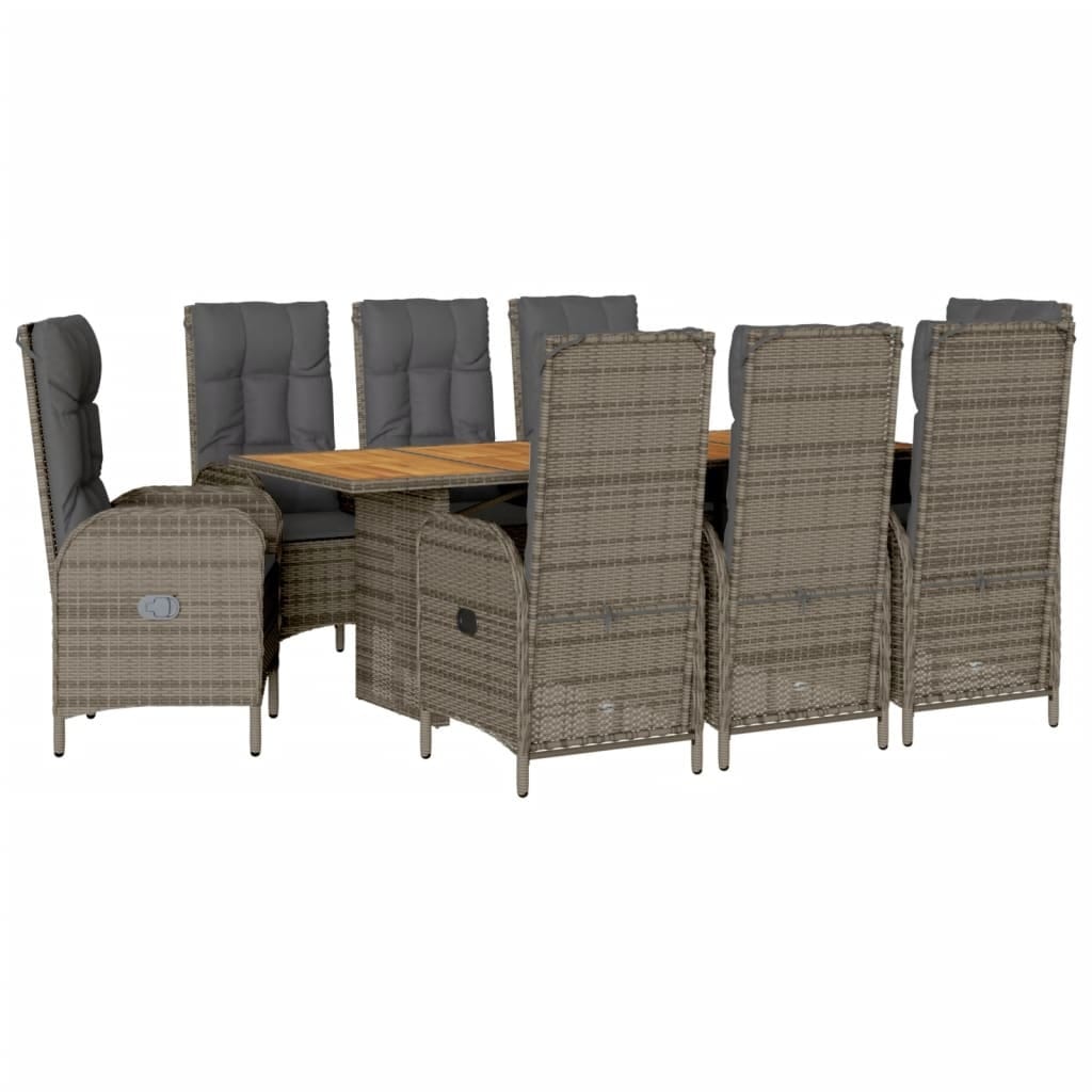 This garden dining set is a beautifully crafted 9-piece set that merges functionality with comfort. It’s perfect for enjoying meals outdoors with family and friends. The elegant grey poly rattan and solid acacia wood tabletop create a classy outdoor dining atmosphere, making it ideal for everything from BBQs to patio parties.