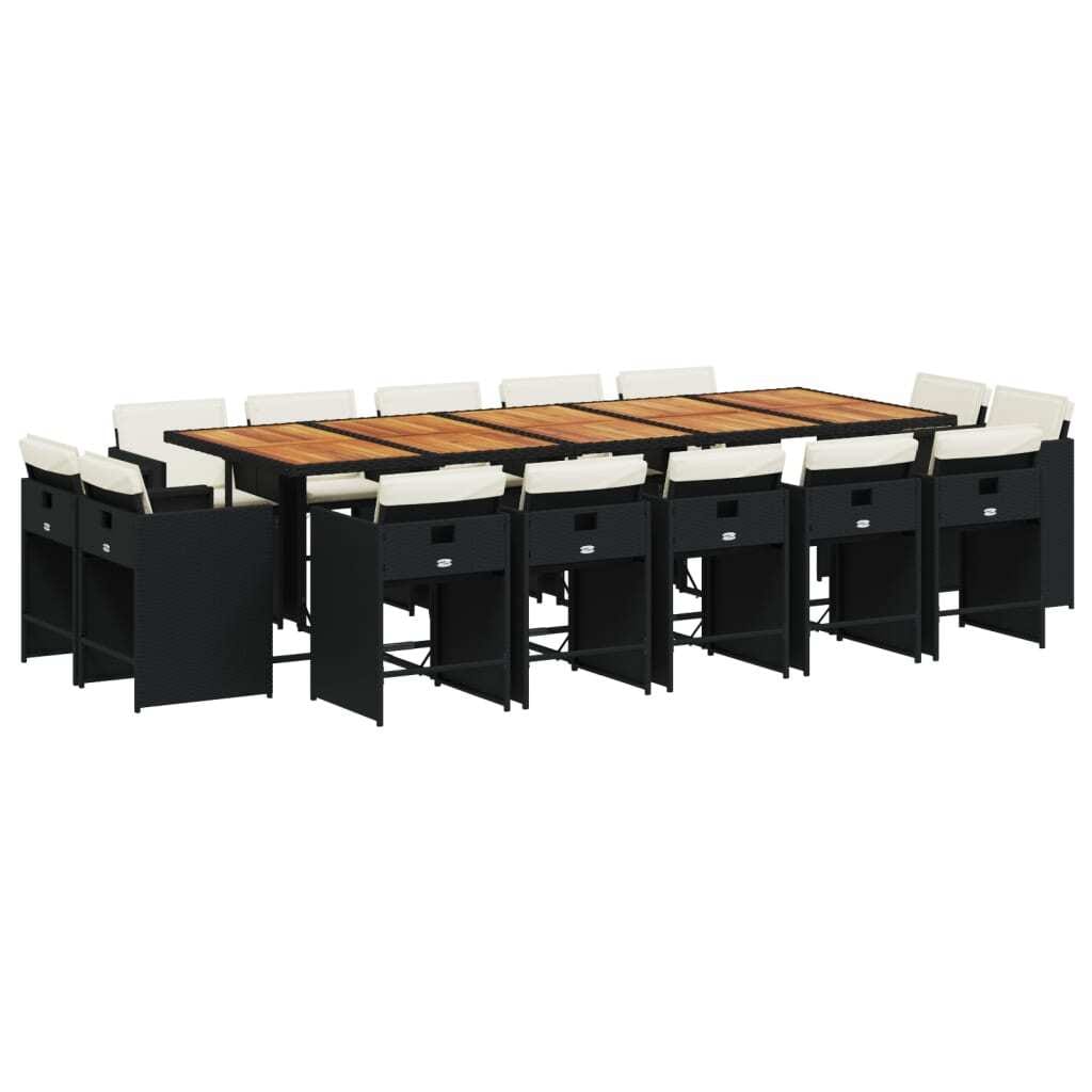 This 14-seater modern patio dining set blends elegance and practicality, crafting a welcoming spot for outdoor gatherings and alfresco dining. Showcasing a gorgeous design with a slick surface made from solid acacia wood, the set features fourteen high-back chairs with comfy cushions that you can easily pop off, adding both comfort and style to any occasion while sprucing up your outdoor look.