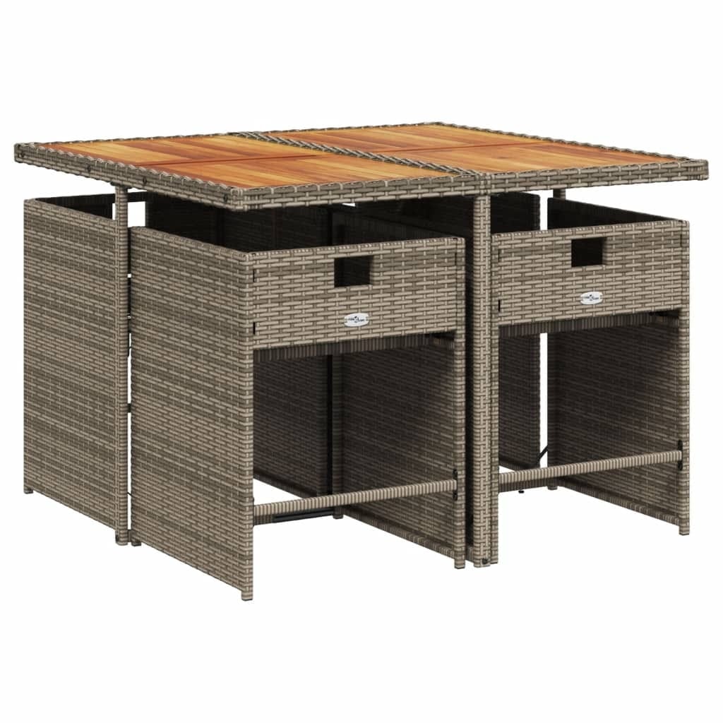 This 5-piece garden dining set is all about mixing style with practicality, perfect for sprucing up your outdoor space. With a modern design, it features a blend of gray poly rattan and solid acacia wood, creating a lovely setting for outdoor meals and gatherings.