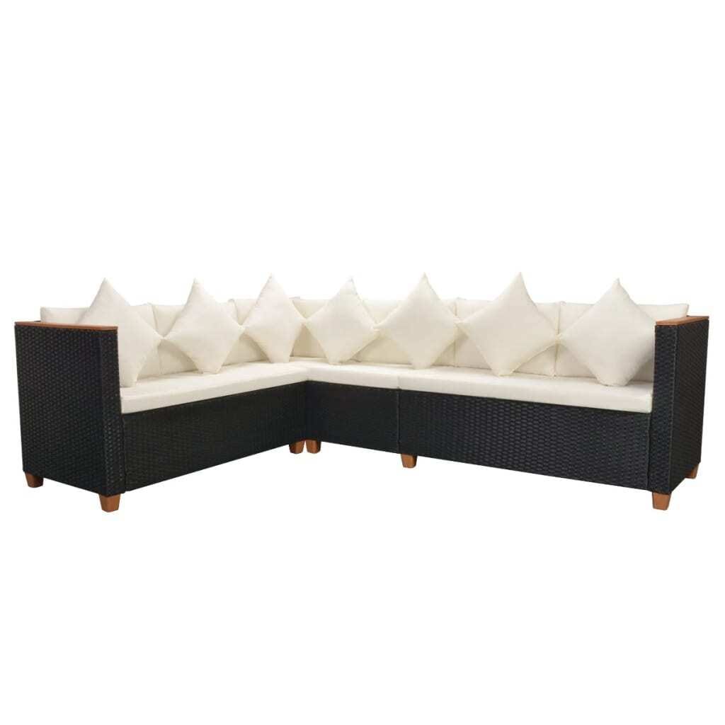 This large 5-piece garden lounge set not only offers enough seating for up to six guests but also does it with style and comfort. With a modern look in mind, the set features a mix of sleek black synthetic poly rattan and strong powder-coated steel, giving it a contemporary vibe suitable for any outdoor space, from patios to gardens.