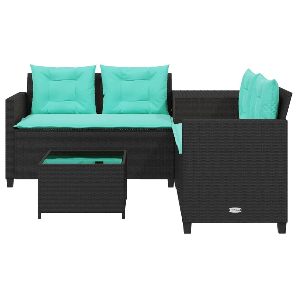 This L-Shaped 4-Seater Patio Sofa Set is the perfect mix of style and comfort, letting you enjoy your outdoor spots with family and friends. Its smart design features a sleek black poly rattan frame paired with bright turquoise cushions, creating a fab atmosphere for chilling and chatting in your garden, terrace, or patio.