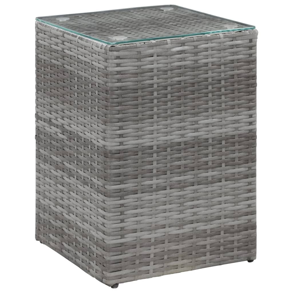 This set of three side tables is a smart and stylish option for your living space, whether it’s in the living room or on the balcony. Made from gray poly rattan with clear glass tops, these tables bring together functionality with modern design, perfect for serving coffee, holding lamps, or displaying decorative pieces.