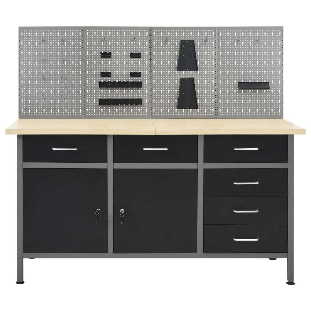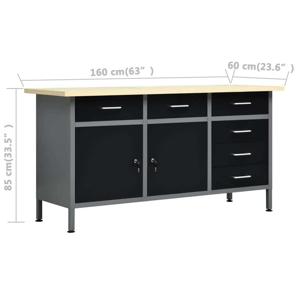 The heavy-duty workbench, standing out with ample storage space and 1102.3 lb loading capacity. This large and sturdy tabletop provides a stable platform for all your repair works. The workbench has 6 drawers, ensuring that you can organize your tools, parts and accessories such as screws, nails and adhesive tape well. All drawers are equipped with ball bearing mechanism for smooth sliding. There are 2 shelves and a large compartment with 2 lockable doors, to accommodate drills, cable drums and grinders. Additionally, the feet are height-adjustable. This workstation is crafted from premium steel and engineered wood, making it extra sturdy, durable and easy to clean. It is easy to assemble.